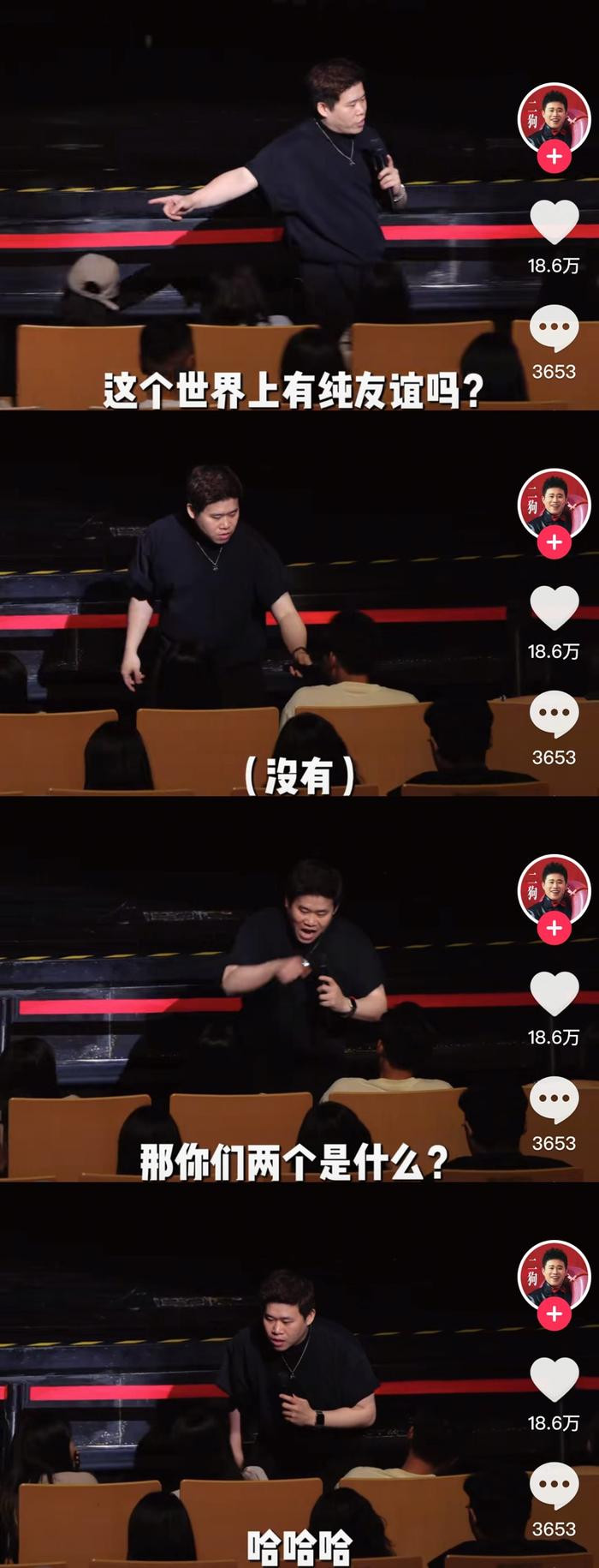 抖音粉丝达到691.6万,仅《一条名叫爱情的狗》就已在全球巡演150余场,在广深等热门城市,连开数天的千人场演出往往在开票后两三分钟便宣布售罄。有头部脱口秀厂牌负责人告诉我们,如果从票房成绩来看,相较于小鹿、呼兰这些因为线上节目被大众熟知的明星,二狗才是当下中国脱口秀互动中最卖座的演员。